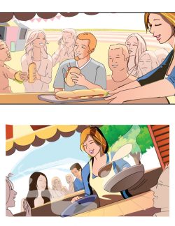 man at cafe ordering from female waiter – line art