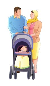 / muslim arab couple with kid in stroller