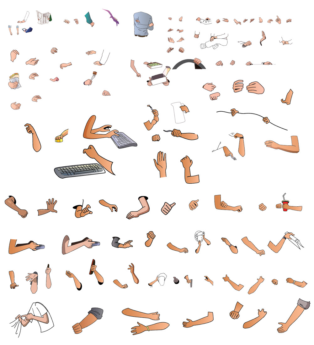 over 120 different hand gestures drawn in full color vectors for easy and fast cartoon character design, storyboards or clipart making. fully editable in AI or EPS, these vectors will help you speed up your vector drawing by providing you with nearly any hand movement you need for your vector drawings.