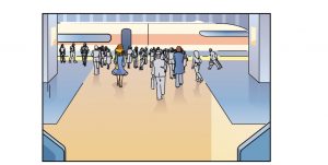 wide shot of people in modern train station