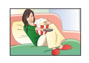 young woman in pajamas eating pop corn